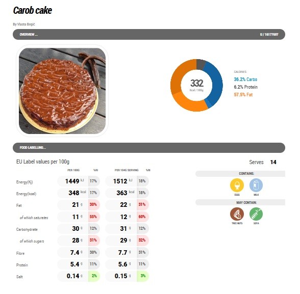 - Zasitni desert u kominaciji proteinam, masti i šećera uz vlakna (šećeri su u kombinaciji s proteinima i opterećenje glukozom je manje) GI = 39 ≤ 50 = niski glikemijski indeks. GL/glicemic load= 11,8 je srednje glikemijsko opterećenje (11- 19). Kofein: 10,9 mg (iz kakaa)
